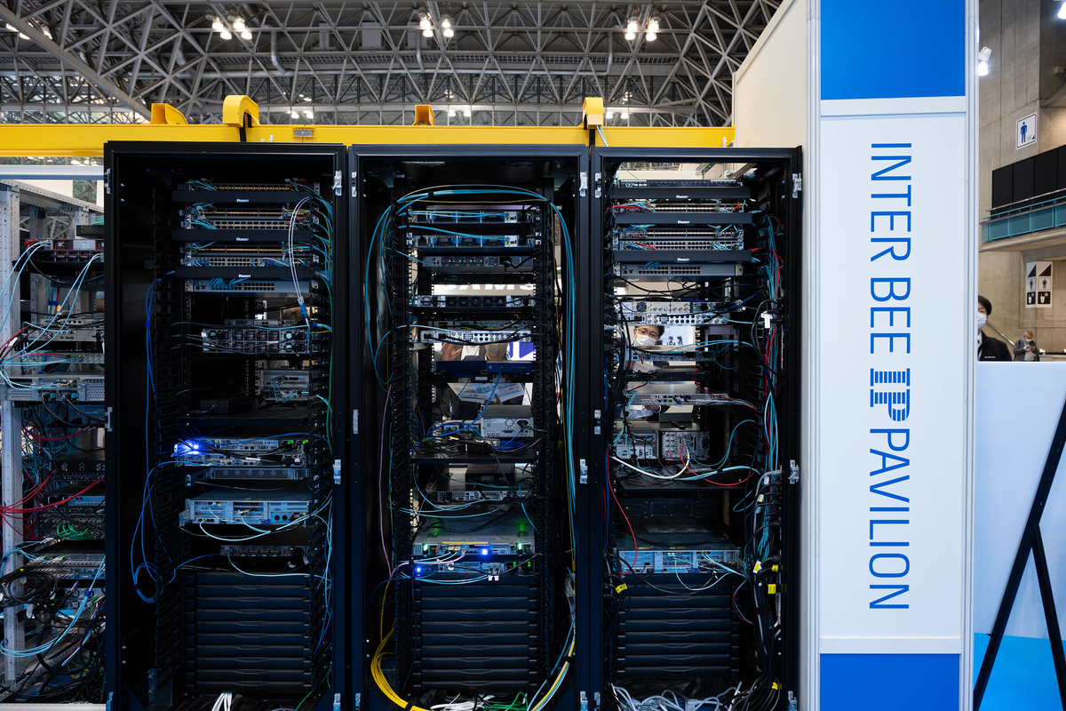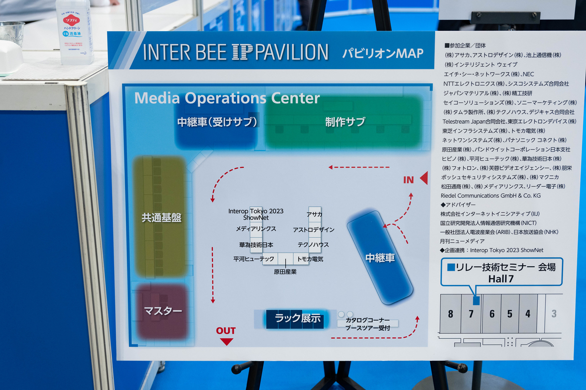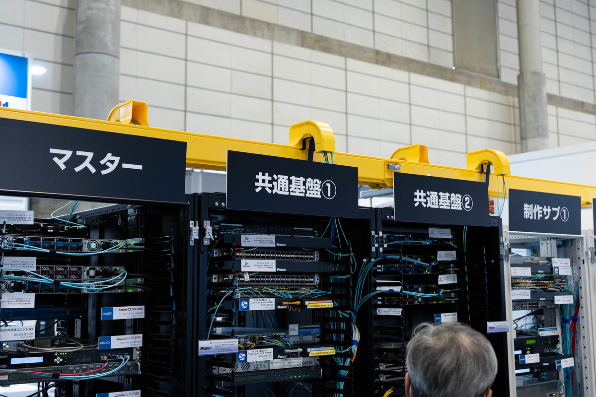 ちなみにこちらは展示場入ってすぐの場所に設置してあった IP パビリオンというエリアです。サーバーラックにネットワーク機器とサーバーらしきものが見え、マスター・共通基盤・制作サブという札が貼ってあります。