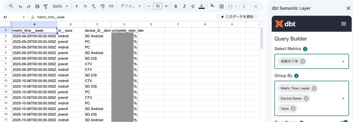 dbt Platform の セマンティックレイヤー(Semantic Layer) 機能を導入し、広告ビジネス指標の定義の一元管理を目指しています。一部データモデルでは既にこれを導入しており、Google スプレッドシートの dbt Semantic Layer アドオンを使って、定義されたメトリクスに従った数値をスプレッドシート上で直接取得できるようにしています(下図)。