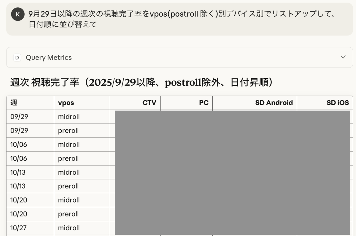 dbt Labs が公開している dbt MCP Server を利用することで、LLM がセマンティックレイヤーで定義されたメトリクスやディメンションの情報を参照し、ユーザーの自然言語による問い合わせを適切な Semantic Layer API 呼び出しに変換できます。現在 PoC を進めており、「先週のデバイス別視聴完了率を教えて」といった問い合わせに対して正しい結果を返せることを確認しています。